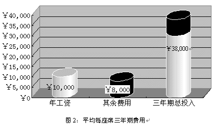 就中國目前的經(jīng)濟水平而言,一個座席人員年收入(包括工資、獎金、福利等等)大約為¥10,000,而每個座席人員所配備的軟硬件設(shè)施合計約為¥5,000;據(jù)專業(yè)機構(gòu)統(tǒng)計,中國的座席人員平均穩(wěn)定的工作年限為三年,而在這三年為了保證座席人員能夠準確、高效的實現(xiàn)對用戶提供專業(yè)服務,所投入的培訓費用大約為¥3,000。所以在三年期間為每個座席的平均花費為¥38,000。