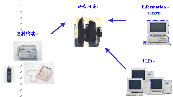 在這樣的體系結(jié)構(gòu)中,各種終端通過PSTN網(wǎng)絡(luò)聯(lián)接到語音網(wǎng)關(guān),而通過語音網(wǎng)關(guān)來訪問后臺的數(shù)據(jù)服務(wù)、應(yīng)用服務(wù),或者通過互聯(lián)網(wǎng)絡(luò)訪問各個語音ICP。