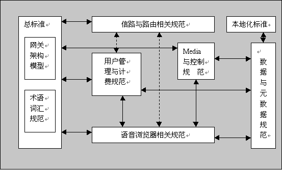 通過分析國際上各種語音網(wǎng)關(guān)系統(tǒng)極其技術(shù)規(guī)范,特別是參照 W3C組織的"Voice Browser" Activity的框架,我們認為作為一個比較完整的語音網(wǎng)關(guān)標準體系,應(yīng)該包含以下具體標準規(guī)范的制定,通常稱之為標準需求。下圖顯示所需的規(guī)范類型及其相互關(guān)聯(lián)。