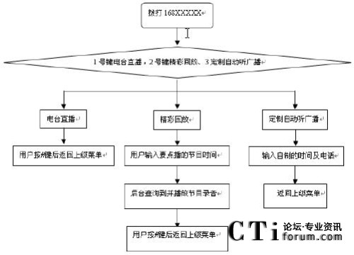 用戶使用時可通過固定話機、小靈通或手機撥叫業(yè)務(wù)特號進入系統(tǒng),根據(jù)系統(tǒng)的語音提示按鍵選擇收聽不同的電臺節(jié)目,在收聽廣播的過程中,可按下電話機上的#字鍵返回上級菜單提示音,以滿足用戶在收音過程中需要不斷調(diào)換頻道的要求。