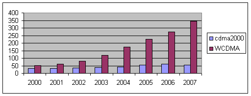 2000年,3G市場收入在cdma2000(大約31億美元,占38%)與WCDMA(大約50億美元,占62%)分布為1/3比2/3。我們不難看出,這種變化有利于WCDMA。到2007年,預計WCDMA將占全部市場收入的86%。這是由于對于WCDMA,運營商需要增加支出來將其網(wǎng)絡升級為GPRS、EDGE與WCDMA。同時,在預測期內(nèi),TDMA運營商最終要將其所有現(xiàn)存的TDMA與模擬特性升級為GSM/GPRS。相比之下,CDMA運營商處于良好的狀態(tài),其現(xiàn)有基礎設施的大部分軟件已經(jīng)升級。CDMA運營商,如Verizon,確實也有模擬特性,但是較之GSM/TDMA而言,它們要低得多。CDMA運營商支出的大部分將以新的Cell sites的形式出現(xiàn)的覆蓋率。