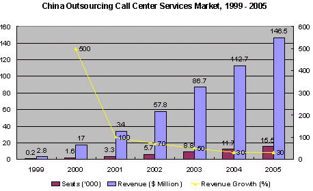 Frost & Sullivan公司研究表明在2000年,中國外包呼叫中心服務市場價值1700萬美元,共有1600坐席。本座席數(shù)是按照實際工作量來計算的,物理上存在的坐席數(shù)要超過2300個。因為許多坐席是在2000年下半年末才建成投入使用的,并且工作任務也沒有滿負荷。