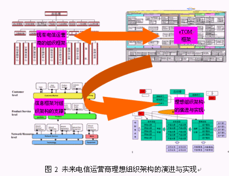 現(xiàn)有的電信運(yùn)營商的管理架構(gòu)向理想的管理組織架構(gòu)演進(jìn)過程中,要涉及到不同的中間過程和步驟,對中間過渡狀態(tài)的評估和有效實(shí)現(xiàn),是實(shí)現(xiàn)演進(jìn)的關(guān)鍵,F(xiàn)有組織架構(gòu)管理職能的對應(yīng),業(yè)務(wù)流程的標(biāo)準(zhǔn)化,管理流程的標(biāo)準(zhǔn)化,企業(yè)IT支撐架構(gòu)對業(yè)務(wù)職能部門的支撐,這些環(huán)節(jié)都是運(yùn)營商應(yīng)該重點(diǎn)考慮的中間內(nèi)容。圖2顯示了未來電信運(yùn)營商理想組織架構(gòu)的演進(jìn)與實(shí)現(xiàn)過程。其中的任何一個(gè)環(huán)節(jié)都是電信運(yùn)營管理研究的核心課題,也直接影響到了電信運(yùn)營管理變革的成敗。