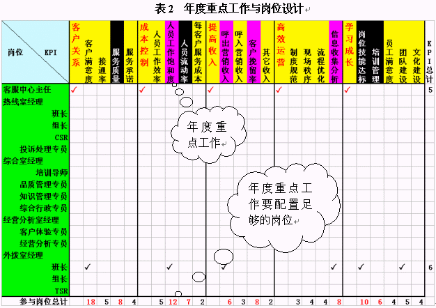 在這里,我們先以崗位設(shè)計來舉例。經(jīng)常有呼叫中心主管把每個崗位的職責(zé)都設(shè)計的非常詳細(xì),包括了每天來做什么,說什么,錄入什么,甚至是打掃某區(qū)域衛(wèi)生之類。但是,我看遍了每一條,也沒找到這個崗位應(yīng)該對什么業(yè)績"負(fù)責(zé)任",該對哪些工作做出貢獻。此處建議各位把效益評價體系、年度重點工作與崗位設(shè)計結(jié)合起來。如表2所示,我們可以把效益評價體系作為KPI放在橫坐標(biāo)中,而崗位設(shè)置則是縱坐標(biāo)。每個崗位對應(yīng)的行中,可以勾畫其應(yīng)負(fù)責(zé)或者做出主要貢獻的項目。這些項目不能超過6個,因為太多的項目會使得這個崗位無所適從,最終的結(jié)果是哪個也沒做好。當(dāng)你勾畫完成之后,請計算每列的"對勾"數(shù)目,看看你本年度的重點工作是不是有較多崗位負(fù)責(zé)呢?