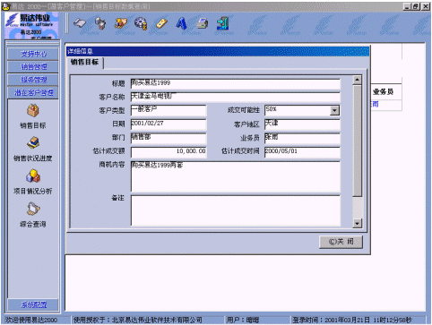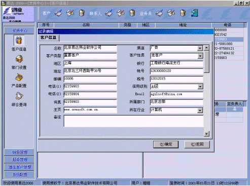 北京易達偉業(yè)軟件技術有限公司是由一群年輕的知識型創(chuàng)業(yè)者及投資機構共同投資創(chuàng)立的,正式成立于1999年10月,是國內(nèi)較早進行CRM軟件專業(yè)研發(fā)和推廣的領導廠商之一。