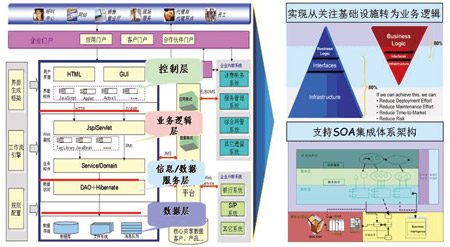 在具體實(shí)現(xiàn)的技術(shù)路線上,產(chǎn)品采用以J2EE為核心的層次化體系結(jié)構(gòu),基于業(yè)務(wù)流程管理和業(yè)務(wù)規(guī)則管理引擎,實(shí)現(xiàn)界面表現(xiàn)層與業(yè)務(wù)邏輯層、業(yè)務(wù)邏輯層與應(yīng)用組件層、應(yīng)用組件層與數(shù)據(jù)訪問(wèn)層、數(shù)據(jù)訪問(wèn)層與數(shù)據(jù)存儲(chǔ)層之間的分離,支持統(tǒng)一的權(quán)限管理和認(rèn)證機(jī)制以及統(tǒng)一的企業(yè)門(mén)戶接入。(如圖1所示)