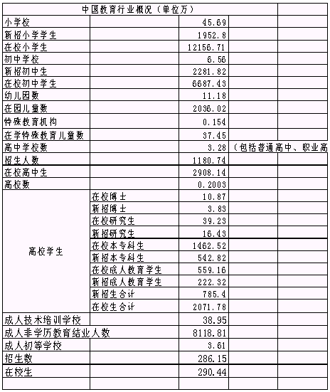按照教育部2002年發(fā)布的《2002年全國教育事業(yè)發(fā)展統(tǒng)計(jì)公報》,教育部將整個社會的教育各個環(huán)節(jié)分為以下幾個部分: