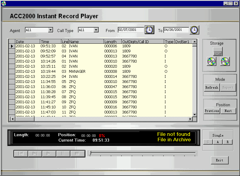 管理員可以通過MMPlayer對(duì)錄制的語音進(jìn)行回放,系統(tǒng)提供完善的檢索功能,可以根據(jù)來電時(shí)間、來電號(hào)碼、呼入/呼出以及座席等條件靈活地進(jìn)行查詢,很容易地找回所儲(chǔ)存的每個(gè)座席各種事件的詳細(xì)信息,并可以轉(zhuǎn)換成通用的.WAV格式文件在任何PC上進(jìn)行播放,或者通過局域網(wǎng)絡(luò)或互聯(lián)網(wǎng)進(jìn)行分發(fā)。