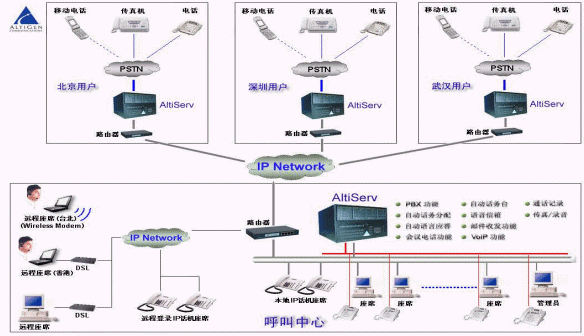 AltiCenter 將奧迪堅所倡導的基于IP分布式呼叫中心技術完美轉化為產品,為用戶輕松構建基于IP的分布式呼叫中心系統(tǒng)。該呼叫中心不僅提供語音電話,還能提供包括音頻視頻在內的多媒體通信;不僅能支持傳統(tǒng)的電話終端,還能支持來自Internet的語音、數據信息等多種交互方式;不僅提供了完整的本地座席功能,還提供遠程IP座席,遠程IP專家座席,并提供高度統(tǒng)一實用的呼叫中心管理體系。AltiCenter在設計之初就采用IP內核的一體化設計,不需要任何語音網關設備,就可以在網絡上構建一個語音和數據的統(tǒng)一平臺,無論在世界的哪個角落,遠程IP座席和分布的異地機構都可以共享客戶的所有資源(語音、數據、座席),由于采用了先進的VoIP技術,可以為各地的電話和Internet的客戶提供統(tǒng)一的客戶號碼和統(tǒng)一的客戶服務,并極大地降低呼叫中心的運營成本,真正幫助用戶建立一個高效的、信息共享的分布式呼叫中心系統(tǒng)。
