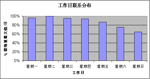 在規(guī)劃客戶服務(wù)中心規(guī)模時,最困難的問題之一是:通過時間估計呼叫分配。通過一個 24 x 7 的工作安排,移動電信公司必須按天估計他們將要處理的聯(lián)系量。下圖顯示一個移動電信公司工作日典型的聯(lián)系分布:
