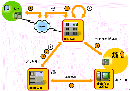 ②呼叫到達(dá)業(yè)務(wù)交換機并通知服務(wù)器(ANI –自動號碼識別)