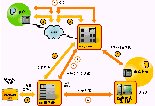 在“呼出”交互中,一個標(biāo)準(zhǔn)的客戶服務(wù)系統(tǒng)應(yīng)該預(yù)裝有一個用于執(zhí)行的聯(lián)系人列表,然后自動生成呼叫并且將呼叫分配至可用的座席代表,如下圖所示: