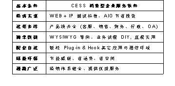 CESS消費型服務軟件具有經(jīng)濟實惠、選擇多樣、簡單快捷、配套自選、綠能環(huán)通路廣泛等特點,采用Web+IP的潮流科技,AIO節(jié)省投資,使軟件經(jīng)濟實惠;CESS軟件產(chǎn)品線齊全,涵蓋客服、銷售、財務、行政、OA等很多方面,給您多樣選擇;WYSIWYG(所見即所得)導向,業(yè)務流程DIY,讓您至需要動動鼠標就可以DIY您想要得到的設計,不再需要麻煩IT人員,只管實用,簡單快捷;輕松Plug-in & Hook其它應用與通信環(huán)境,可根據(jù)您的需要配套自選;節(jié)能減碳、省話費、省空間,綠色環(huán)保;經(jīng)銷體系健全、提供優(yōu)質(zhì)服務,通路廣泛。