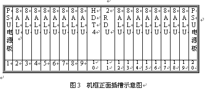 見圖2和3,遠(yuǎn)端模塊采用19英寸標(biāo)準(zhǔn)機(jī)框,高度為5U,可安裝在各種標(biāo)準(zhǔn)的19英寸的機(jī)柜中。機(jī)框共20個插槽,正面插板,反面背板出線。每個機(jī)框可插20塊各種類型的板件,其中兩邊第1第20槽固定插電源板PSU,中間第10號槽固定插數(shù)字中繼接口板HDT4,其余16個槽為通用槽口,可插16塊各種類型接口板。每塊板為8路,一個機(jī)框總共128話路。調(diào)度接口板2RDU固定插第11槽,該板不占機(jī)框端口。對于自帶交換系統(tǒng),需要安裝一塊系統(tǒng)信號音板8TDU,該板固定插19槽,占8個端口。