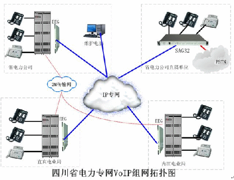 說明:南椏河電廠在現(xiàn)有的IP網(wǎng)絡(luò)基礎(chǔ)上,利用IP中繼網(wǎng)關(guān)EEG與SAG32電信級模擬VoIP網(wǎng)關(guān)實現(xiàn)交換機的遠程放號,實現(xiàn)了發(fā)電站與電廠、省電力網(wǎng)、電信等的組網(wǎng),解決了實際的通信問題。在方案中,具有組網(wǎng)簡單,維護方便,通話質(zhì)量高等特點,得到當(dāng)?shù)赜脩舻恼J可。