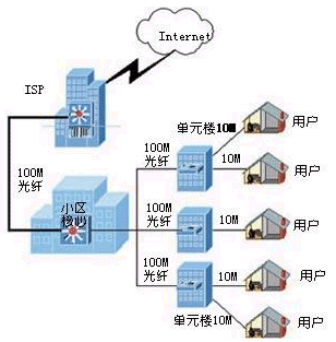 寬帶小區(qū)網(wǎng)絡(luò)建設(shè)采用基于三層交換的千兆以太技術(shù),在小區(qū)核心引入帶光口的千兆以太網(wǎng)交換機,通過光纖以千兆速率上連至ISP接入?yún)^(qū)域交換機。小區(qū)內(nèi)部形成星型結(jié)構(gòu),每棟單元樓內(nèi)放置帶百兆光口的以太網(wǎng)交換機,通過百兆光纖將小區(qū)核心和單元樓連接起來。樓宇內(nèi)部布放五類線,連至用戶計算機的網(wǎng)卡,使最終用戶上網(wǎng)速率達到10M或更高。
