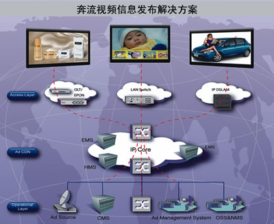 UT斯達(dá)康緊跟市場(chǎng)發(fā)展趨勢(shì)和運(yùn)營商步伐,深入研究戶外液晶廣告業(yè)務(wù)的發(fā)展、大力推進(jìn)廣告平臺(tái)的研發(fā)。2006年,UT斯達(dá)康推出了奔流(RollingStream)視頻信息發(fā)布解決方案(如圖2所示)。奔流視頻信息發(fā)布解決方案是以奔流(RollingStream)IPTV平臺(tái)為基礎(chǔ),結(jié)合戶外液晶廣告市場(chǎng)需求,融合運(yùn)營商以視頻為主的綜合信息發(fā)布的需求,真正運(yùn)營級(jí)的電信級(jí)解決方案。該方案可以幫助運(yùn)營商實(shí)現(xiàn)融合信息服務(wù)和廣告業(yè)務(wù)的統(tǒng)一運(yùn)營,幫助運(yùn)營商開展兼具公益性和盈利性的信息發(fā)布業(yè)務(wù),運(yùn)營商在推進(jìn)社會(huì)信息化、造福公眾的同時(shí),通過視頻廣告的運(yùn)營,也能獲取盈利。該方案基于電信級(jí)平臺(tái)的穩(wěn)定性、安全性、擴(kuò)展性設(shè)計(jì)要求,可支持百萬級(jí)大規(guī)模部署能力,可提供電信級(jí)質(zhì)量保證的服務(wù);該方案基于IP流媒體技術(shù),可通過IP網(wǎng)絡(luò)實(shí)時(shí)、精準(zhǔn)、互動(dòng)地投放廣告內(nèi)容,從而可以支持豐富、新穎的廣告運(yùn)營模式;該方案基于數(shù)字多媒體技術(shù),除了可以發(fā)布視頻廣告,還可以發(fā)布圖片、文字、消息等廣告內(nèi)容。