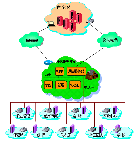 以國際標準的VXMLl技術(shù)為主導(dǎo)的小區(qū)服務(wù)中心系統(tǒng)可以與互聯(lián)網(wǎng)輕易地連通,從而為小區(qū)的服務(wù)網(wǎng)點走出小區(qū)的地域限制做好技術(shù)上的儲備。vxml的易開發(fā)和易擴展性,使得遠程服務(wù)的增加,幾乎不需要任何成本的追加,任何第三方服務(wù)提供者具備vxml業(yè)務(wù),都可以直接掛到服務(wù)中心上來。