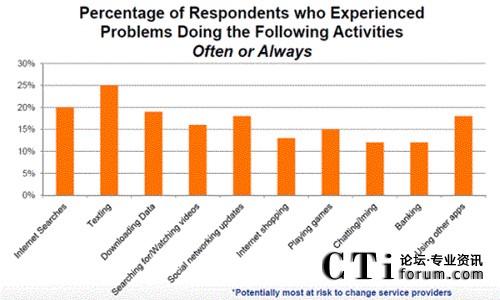 調(diào)查顯示,超過2/3的美國智能手機(jī)用戶從事一些最常見的活動(dòng)時(shí),遭遇了網(wǎng)絡(luò)服務(wù)問題,包括互聯(lián)網(wǎng)搜索、數(shù)據(jù)下載、搜尋或觀看視頻和社交網(wǎng)絡(luò)。此外,在調(diào)查中發(fā)現(xiàn),當(dāng)他們遇到服務(wù)和中斷問題時(shí),消費(fèi)者把責(zé)任歸罪于他們的移動(dòng)網(wǎng)絡(luò)運(yùn)營(yíng)商商(MNO)。事實(shí)上,幾乎所有被調(diào)查的智能手機(jī)用戶的一半,由于他們的體驗(yàn)問題抱怨他們的移動(dòng)網(wǎng)絡(luò)運(yùn)營(yíng)商商(MNO)。
