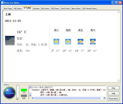 比方說這個關(guān)于空調(diào)問題,我們過去,空調(diào)的命令詞是“把空調(diào)打開,空調(diào)溫度提高3度!爆F(xiàn)在我也可以這樣說,空調(diào)調(diào)高一點(diǎn),我有點(diǎn)冷,也可以。就是你在車?yán)镞呁耆梢杂媚阕约旱恼Z言來說你想干的事。比如說,前邊你不知道明天天氣會怎么樣,人一般都會想想,明天天氣如何,或者是告訴我天氣預(yù)報(bào)。但是你也可以這樣說。明天會下雨嗎?也可以這樣說。或者你這樣說,你說,今天大盤怎么樣。完全是用自然語言來說。堵不堵車,“查詢交通情況!边@就是,實(shí)際上可以有各種不同的說法來完成這個任務(wù),這是我們自然語言的一個演示。