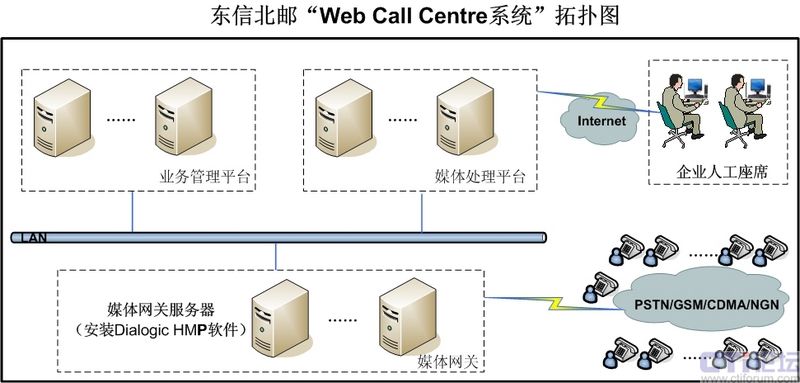 采用“Dialogic HMP軟件“方案,EB非常輕松地將Internet和電信語音網(wǎng)絡(luò)有機(jī)地結(jié)合起來,實(shí)現(xiàn)了Internet與PSTN、GSM、CDMA、NGN等多種通信方式的融合。用高效快捷、經(jīng)濟(jì)合理、易于擴(kuò)展的方式實(shí)現(xiàn)了完善且靈活的呼叫中心功能。