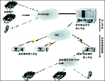 目前,根據(jù)建設(shè)思路中所提到的分期實(shí)施原則,第一期只完成本地多方電話會議中心平臺的建設(shè)。參加電話會議的各方用戶均直接通過公眾電話網(wǎng)撥入中心平臺,由中心平臺統(tǒng)一接入并組織會議資源為用戶服務(wù),結(jié)構(gòu)如圖2所示。