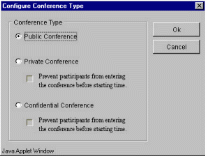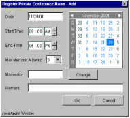 TeleConference系統(tǒng)內(nèi)的任一個分機,都可以利用瀏覽器(Internet Browser)來預約會議時間,而參加會議的人可以在會議開始時,自動打電話進系統(tǒng)參加會議就像加入“聊天室“一樣簡單。