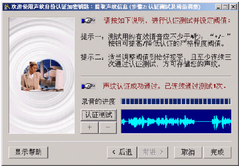 完成上述步驟后,點(diǎn)擊"完成"按鈕,系統(tǒng)將把該用戶的聲紋信息,以及音量設(shè)置、閾值設(shè)置等信息保存起來(lái),供隨后的"身份驗(yàn)證"過(guò)程使用。