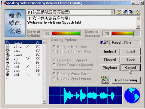 "得意"口語學(xué)習(xí)系統(tǒng)的原理是基于語音音素及其他參數(shù)的提取與分割,將使用者的語音音素系列與標(biāo)準(zhǔn)模型的語音音素序列進行自動比對,并將比對結(jié)果通過視圖形象而直觀地給出,從而對學(xué)習(xí)者的語音給出恰當(dāng)?shù)脑u價(比如對每個音素給出一個得分等),以幫助其改進和提高口語發(fā)音,使其接近或達(dá)到語音的標(biāo)準(zhǔn)水平。由于利用可視化的朗讀評分等人機交互的方式,而且通過視覺、聽覺等綜合手段,反復(fù)提示和幫助用戶接近標(biāo)準(zhǔn)發(fā)音,因而顯著提高了學(xué)習(xí)者的學(xué)習(xí)興趣,這對提高英語學(xué)習(xí)成績有很多幫助。