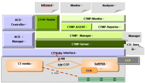 以CCP為基礎的CTMP Suite系統(tǒng)軟件不僅為顧客聯(lián)絡中心準備了多樣化的、便利性的實用功能,而且還提供整合性管理接口與簡易方便的維護服務,此外,該系統(tǒng)軟件還能根據(jù)顧客的要求,在同一平臺上兼容運行IVR、VMS(語音郵件系統(tǒng)-Voice Mail System)、VRS(語音記錄系統(tǒng)-Voice Recording System)等多樣化的解決方案程序。系統(tǒng)結構圖如下: