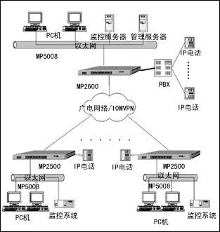 各分店用一臺MP2500路由器,配雙以太口,一個口接MP5008交換機組建本地以太網(wǎng),一個口接廣電的10MVPN,以實現(xiàn)本地以太網(wǎng)與總店、各分店、配送中心等連接。配1個RM2-1VoIP單路IP電話模塊,直接下掛普通電話機,以實現(xiàn)全網(wǎng)IP電話免費,同時還可以通過總店的程控交換機與市話連接。分店以太網(wǎng)中,掛有監(jiān)控系統(tǒng)、PC機、醫(yī)保讀卡器等。模塊化設計提供了網(wǎng)絡擴展的空間,滿足未來業(yè)務的發(fā)展。邁普的路由器提供多種模塊,用戶可以根據(jù)實際需要加裝不同的模塊,滿足不同環(huán)境的使用要求。模塊化設計可以極大地方便設備的維護,并為今后的網(wǎng)絡升級改造提供足夠的預留空間。