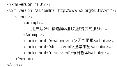 下面是一個VoiceXML的簡單例子。當用戶與電話語音系統(tǒng)接通以后,將會聽到語音合成的提示信息"用戶您好!請選擇我們?yōu)槟峁┑姆⻊眨?。當用戶說"股票市場",語音瀏覽器就會通過語音識別功能識別用戶的選擇,然后把對話流程轉(zhuǎn)向另一個VoiceXML腳本文件stocks.vxml。stocks.vxml腳本文件則是一個專門向用戶提供股票市場相關服務的語音網(wǎng)頁。