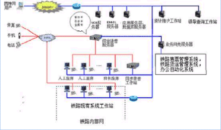 客戶利用電話、傳真、電子郵件、因特網(wǎng)、手機、網(wǎng)絡電話等撥打某統(tǒng)一特服號碼(如100xxxx)進入鐵路客戶服務中心系統(tǒng),本系統(tǒng)依托鐵路各類業(yè)務技術(shù)支持系統(tǒng)和網(wǎng)絡系統(tǒng),通過人工受理或自動語音服務等方式全天24小時不間斷地為旅客、貨主提供各種鐵路服務;形成了對外服務于客戶,對內(nèi)管理、分析、決策系統(tǒng)相結(jié)合的新型客戶服務中心。