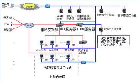 鐵路客戶服務中心系統(tǒng)主要是由帶語音板卡的計算機或排隊交換機、CTI服務器、IVR服務器、應用服務器/數(shù)據(jù)庫服務器、人工座席系統(tǒng)等硬件設備和應用軟件組成。它以電話服務為主要服務方式、結(jié)合計算機信息系統(tǒng)的資料數(shù)據(jù),為客戶提供全方位的服務,包括業(yè)務查詢、業(yè)務咨詢、業(yè)務受理、投訴和建議、市場調(diào)查等功能。