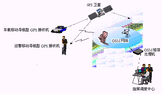 巡警利用移動終端(帶手機通信功能的GPS接收機)發(fā)出報警信號,通過GSM系統(tǒng)送到指揮調度中心。