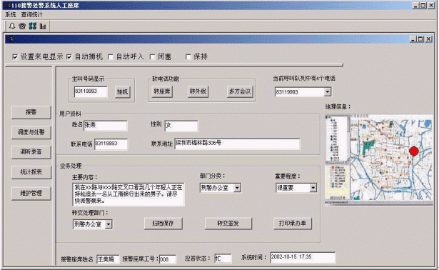 深圳博宇科技公司 110無線報警定位調度系統(tǒng)人工接警座席示意性界面如下: