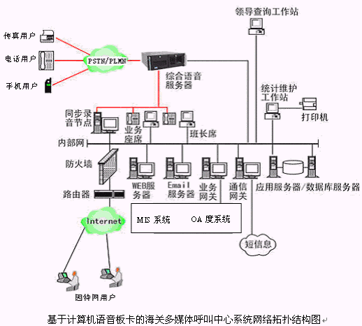 本多媒體呼叫中心的物理結(jié)構(gòu)由帶語音板卡的高工控機、CTI服務器、IVR(交互式語音應答)/IFR(交互式傳真應答)服務器、業(yè)務代表座席(邏輯上分為:普通業(yè)務代表座席、專家座席、WEB座席等)、班長座席/質(zhì)檢座席、統(tǒng)計維護管理工作站、因特網(wǎng)(WEB)服務器、電子郵件(EMAIL)服務器、數(shù)據(jù)庫/應用服務器、錄音留言工作站、領導查詢工作站、業(yè)務網(wǎng)關服務器、通信網(wǎng)關服務器、網(wǎng)絡系統(tǒng)等和應用軟件構(gòu)成。