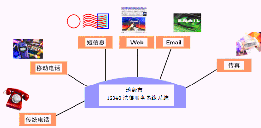 居民利用電話、傳真、手機(jī)等撥打某一特服號碼(如12348)進(jìn)入地級市法律服務(wù)熱線系統(tǒng),本系統(tǒng)依托地級市司法行政部門/法院各類業(yè)務(wù)技術(shù)支持系統(tǒng)和網(wǎng)絡(luò)系統(tǒng),通過人工受理或自動語音服務(wù)等方式全天24小時不間斷地為人民群眾提供各種法律服務(wù);形成了對外服務(wù)于百姓的無形窗口,對內(nèi)管理、分析、決策系統(tǒng)相結(jié)合的多媒體呼叫中心。