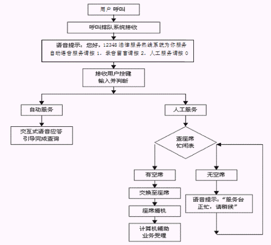 本系統(tǒng)將需轉(zhuǎn)入人工服務(wù)的用戶(電話)語音線路,根據(jù)一定的分配算法,將人民群眾打入的電話合理地分配給后臺的座席操作人員進(jìn)行處理,使系統(tǒng)的工作得以合理的分配。