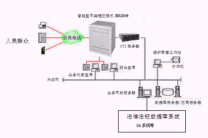該系統(tǒng)的設(shè)計(jì)采用先進(jìn)的三層CLIENT/SERVER網(wǎng)絡(luò)體系結(jié)構(gòu),集目前先進(jìn)的計(jì)算機(jī)技術(shù)、通信技術(shù)、計(jì)算機(jī)電信集成(CTI)技術(shù)、多媒體呼叫接入技術(shù)、智能接入交換分配技術(shù)、數(shù)字語音處理技術(shù)、異構(gòu)系統(tǒng)信息交互技術(shù)、INTERNET網(wǎng)絡(luò)技術(shù)、安全容錯技術(shù)、網(wǎng)絡(luò)組網(wǎng)技術(shù)等于一體,并與地級市司法行政部門/法院已有技術(shù)支持系統(tǒng)(如MIS系統(tǒng)、法律法規(guī)數(shù)據(jù)庫系統(tǒng)等)緊密結(jié)合在一起,突破時空的限制,通過人工座席、自動語音/傳真、司法部門相關(guān)人員等為群眾提供電話、傳真、手機(jī)等多種服務(wù)形式的周到、快捷、全方位的法律服務(wù),為人民群眾與地級市司法行政部門/法院之間架起一座密切聯(lián)系的橋梁。