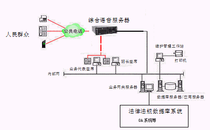 外線撥入系統(tǒng)后,如果選擇自動服務(wù),系統(tǒng)通過交互式語音應(yīng)答方式,引導(dǎo)用戶按鍵完成法律查詢業(yè)務(wù)。