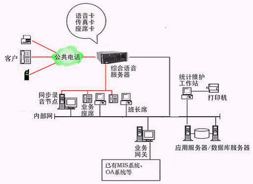 本系統(tǒng)物理結(jié)構(gòu)由帶語音板卡的高性能工控機(jī)(稱為綜合語音服務(wù)器,在功能上可以分為CTI服務(wù)器、IVR(交互式語音應(yīng)答)/IFR服務(wù)器、統(tǒng)計維護(hù)管理工作站、數(shù)據(jù)庫/應(yīng)用服務(wù)器、錄音留言工作站、業(yè)務(wù)網(wǎng)關(guān)服務(wù)器、業(yè)務(wù)代表座席、網(wǎng)絡(luò)系統(tǒng)等和應(yīng)用軟件構(gòu)成。
