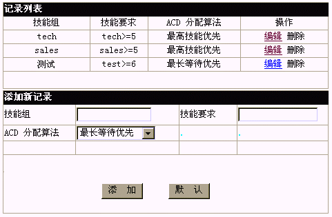 設(shè)置技能組:定義一個(gè)技能組名稱,給出一項(xiàng)技能的值范圍表達(dá)式,凡具備該技能且技能值屬于該范圍的座席,將自動加入該技能組。