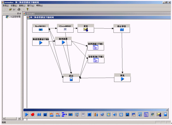 系統(tǒng)提供圖形化的語音流程生成環(huán)境,以方便用戶對語音流層進(jìn)行定制。流程生成器是一套可視化的流程設(shè)計(jì)工具,通過拖拉圖標(biāo)控件、鼠標(biāo)連線即實(shí)現(xiàn)呼叫中心CTI流程的制作,同時(shí),通過運(yùn)行時(shí)鏈接動態(tài)連接庫(DLL),實(shí)現(xiàn)對業(yè)務(wù)數(shù)據(jù)庫的訪問;通過運(yùn)行時(shí)鏈接用戶DLL,最靈活地與用戶應(yīng)用系統(tǒng)結(jié)合;支持多種業(yè)務(wù)集成和動態(tài)流程控制,方便用戶拓展業(yè)務(wù);采用事件驅(qū)動機(jī)制、開放的結(jié)構(gòu),滿足各種語音系統(tǒng)的需要;支持不限個(gè)數(shù)、級數(shù)的IVR結(jié)構(gòu),可滿足用戶非常復(fù)雜的需求。