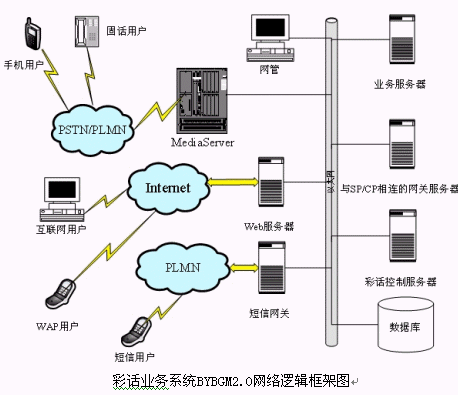 為了描述彩話(huà)業(yè)務(wù)系統(tǒng)BYBGM2.0的呼叫流程,將彩話(huà)業(yè)務(wù)系統(tǒng)BYBGM2.0網(wǎng)絡(luò)邏輯框架圖經(jīng)過(guò)簡(jiǎn)化成為下列網(wǎng)絡(luò)拓?fù)浣Y(jié)構(gòu)圖: