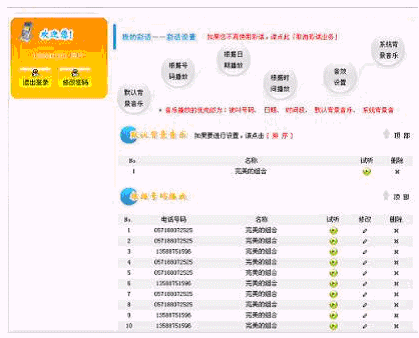 - "彩話(huà)DIY"服務(wù):通過(guò)IVR自己錄制BGM素材或通過(guò)因特網(wǎng)上傳BGM素材;