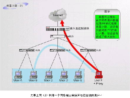 目前所知道的第一種非法運營情況:如上圖中的F用戶合法申請一根ADSL或其他線路然后在自己的計算機中安裝代理服務軟件或者連接一個路由器,就可以糾集若干住戶分攤該專線的租費,并通過該出口共享帶寬訪問外網(wǎng),而且他們同時還可以享受小區(qū)內(nèi)部網(wǎng)絡所固有的所有功能。