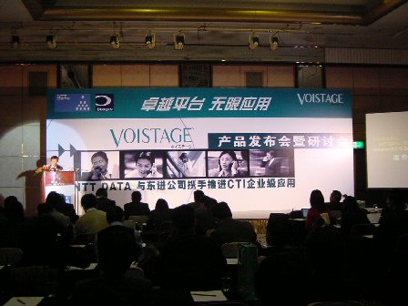 2004年2月19日,NTT DATA(中國)有限公司在北京長富宮飯店舉行了主題為"卓越平臺(tái),無限應(yīng)用"的VOISTAGE產(chǎn)品發(fā)布及應(yīng)用研討會(huì),在會(huì)上發(fā)布了CTI產(chǎn)品VOISTAGE。來自日本NTT DATA總公司的高層在會(huì)上發(fā)表主題演講時(shí)表示,NTT DATA將與戰(zhàn)略合作伙伴東進(jìn)公司攜手共同大力推進(jìn)VOISTAGE產(chǎn)品在中國中小企業(yè)級(jí)市場中的應(yīng)用。