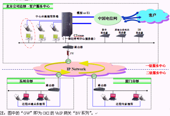 另一方面,OKI則擁有構(gòu)筑大規(guī)模IP電話(huà)的豐富經(jīng)驗(yàn),從最初的窄帶網(wǎng)絡(luò)到最近的寬帶網(wǎng)絡(luò),OKI一直在提供著最適合使用用戶(hù)環(huán)境的、追求音質(zhì)的VoIP產(chǎn)品。伴隨著寬帶網(wǎng)絡(luò)在企業(yè)市場(chǎng)中日益深入的運(yùn)用,及呼叫中心市場(chǎng)中呈現(xiàn)的最新需求,OKI充分將IP技術(shù)運(yùn)用到呼叫中心系統(tǒng)中,推出IP型分散客服中心解決方案。所謂分散型系統(tǒng),是指用網(wǎng)絡(luò)將分散在各個(gè)點(diǎn)的多個(gè)呼叫中心連接起來(lái),作為一個(gè)大規(guī)模中心統(tǒng)一運(yùn)用的系統(tǒng)。