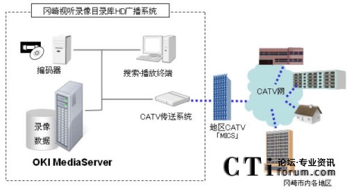 該系統(tǒng)以IP視頻傳輸系統(tǒng)“OKI MediaServer”為基礎(chǔ),是采用支持HD編碼裝置的錄像目錄庫系統(tǒng)。通過簡單的GUI操作可以把編制成目錄的圖像制作成電視廣播節(jié)目并通過CATV電視臺(tái)播放。